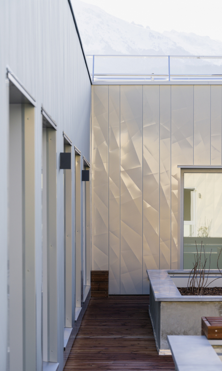 Le projet est composé de deux strates programmatiques : Le basement en béton abrite les salles blanches et constitue le socle sobre et lisse du bâtiment. Au-dessus, le niveau tertiaire en mur à ossature bois paille est recouvert d’un bardage rappelant les wafers sur lesquels les ingénieurs de Unity travaillent. Les facettes des lames d’aluminium recyclé vibrent, évoluent et jouent avec la lumière, passant du doré à un vert léger, du gris mat au gris brillant, reflétant les montagnes enneigées.